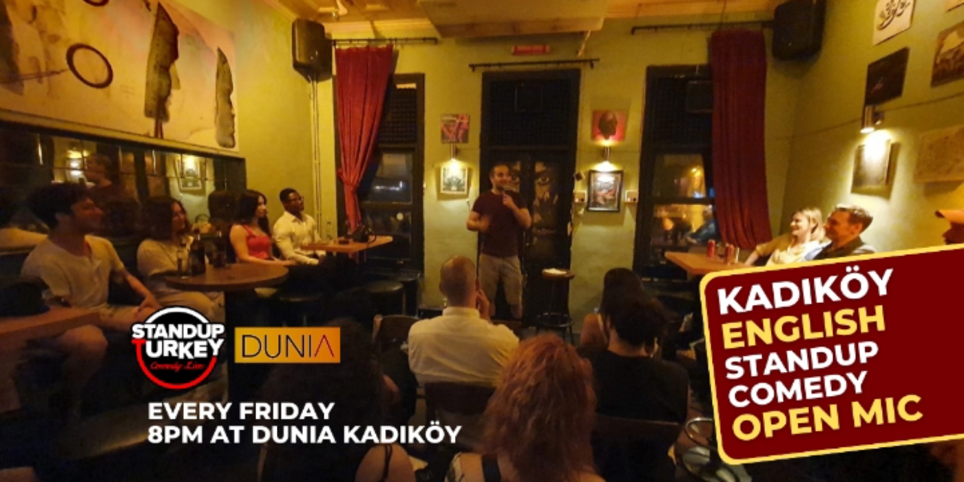 İngilizce stand-up açık mikrofon gecesi her Cuma akşamı 20:00'de Dunia Kadıköy'de! Biletini al, ismini yazdır, sahne senin! Gösteride yerli ve yabancı komedyenler (ve komedyen adayları) taze şakalarıyla bir sahnede buluşuyor. İster seyirci ol, ister sahneye çık! Geceyi her hafta farklı bir deneyimli komedyen sunuyor. Standup Turkey welcomes comedians from all levels to an open mic night at Dunia Kadıköy, every Friday at 8 PM! Show up, sign up, and perform! Each comic gets up to 10 minutes of stage time. If you don't want to perform, that's alright too, we have lovely drinks ready for you to enjoy the show with. Different international comedians host the open mic each week. * The show is entirely in English and is intended for mature audiences over the age of 18. Etkinlik Kuralları: • Etkinlik dili tamamen İngilizce'dir. • Etkinlik 18 yaş üzeri seyirci kitlesine yöneliktir. Etkinlik başlangıç saatinden 15 dakika sonra girişler kapanır. • Gününde ve saatinde kullanılmayan biletler geçersizdir. • Organizasyon sahibi kurum etkinlik alanı oturum düzeninde uygun gördüğü durumlarda yer değişikliği yapma hakkına sahiptir. Numarasız oturma düzenine sahip etkinliklerde katılımcılar alan sorumlusunun yönlendirmesi doğrultusunda oturmayı kabul eder. • Organizasyon sahibi kurum mekansal yahut mücbir sebepler dahilinde etkinlik içeriğinde, başlangıç ve bitiş saatlerinde değişiklik yapma hakkına sahiptir.
